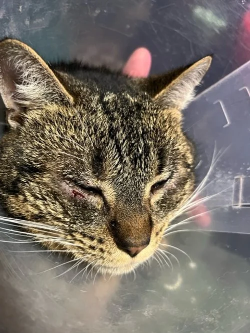 Rheine’s story is a happy one, thanks to his caring and diligent owners (read his owner’s story below). After finally being caught as a stray on their property, Rheine was seen at Fern Hill for painful, goopy eyes that would not go away with medication. Rheine was diagnosed with Entropion, which is an abnormality of the eyelids in which the eyelid rolls inward. This inward rolling often causes the hair on the surface of the eyelid to rub against the cornea, resulting in pain, corneal ulcers, perforations, or pigment developing on the cornea, which can interfere with vision.